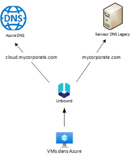 Dans Azure, le principe est similaire à celui de GCP. Cependant, Azure DNS n’est pas (encore) capable de jouer le rôle d’aiguilleur. De ce fait, nous allons positionner notre infrastructure DNS en amont pour qu’elle puisse assumer ce rôle. Installez et configurez un serveur DNS (BIND ou Unbound) dans une VM Azure.