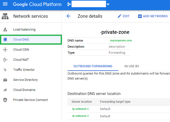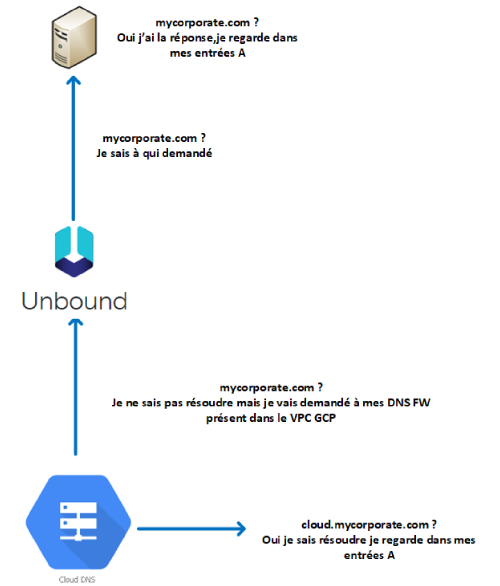 Malheureusement, à l’heure actuelle, il est impossible de forwarder (transférer) des domaines vers des serveurs DNS en dehors de GCP (pas encore). Pour pallier ce manque, nous pouvons installer des forwarders DNS en IaaS pour assumer ce rôle.