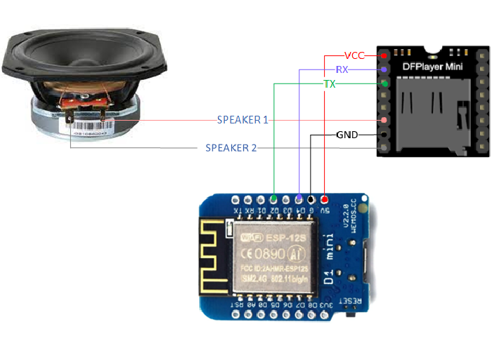 Le câblage est assez simple. Connectez le module DFPlayer Mini MP3 à un microcontrôleur compatible avec ESPHome, comme un ESP01. Vous devrez connecter les broches TX et RX du module aux broches correspondantes du microcontrôleur.