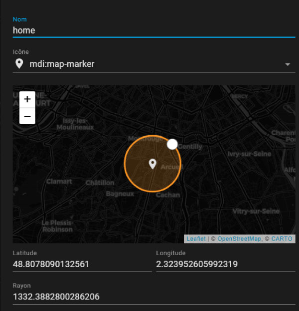 Cette zone correspond à l’emplacement de votre maison et permet à Home Assistant de déterminer si vous et les autres membres de votre famille êtes présents ou non. Voici comment procéder :