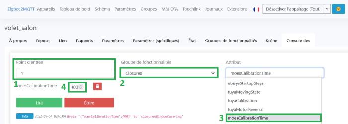 Pour perfectionner à la seconde près le temps de fermeture et d’ouverture, vous pouvez le définir. Pour cela, rendez-vous sur l’interface web de Zigbee2mqtt et remplissez les champs de cette façon :
