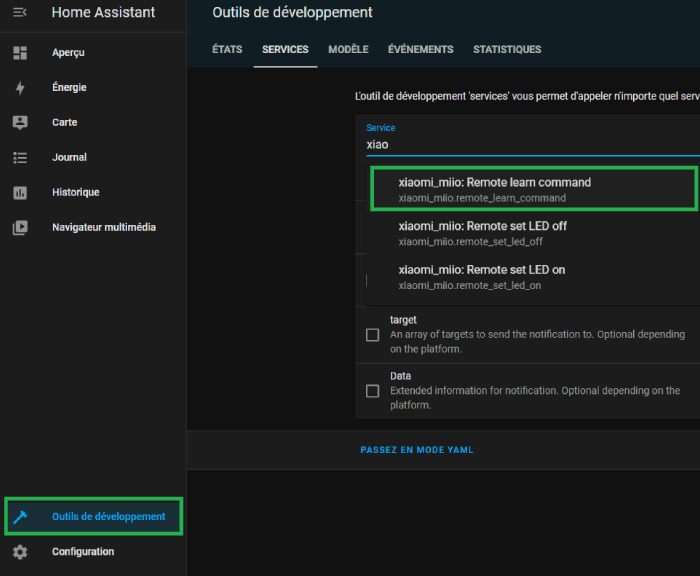 La première étape consiste à cloner le bouton de la télécommande que l’on souhaite reproduire avec notre système. On se rend dans l’onglet service (dans Home Assistant) et on choisit xiaomi_miio.remote_learn_command, puis on sélectionne notre appareil, dans mon cas bedroom_remote :