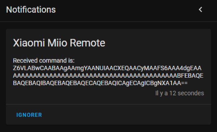 Une fois que l’on a cliqué sur “appeler le service”, on appuie sur le bouton de la télécommande que l’on souhaite reproduire et une notification devrait apparaître dans Home Assistant: