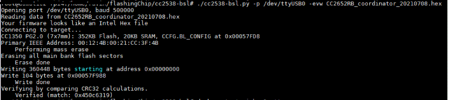 ./cc2538-bsl.py -p /dev/ttyUSB0 -evw CC2652RB_coordinator_20210708.hex